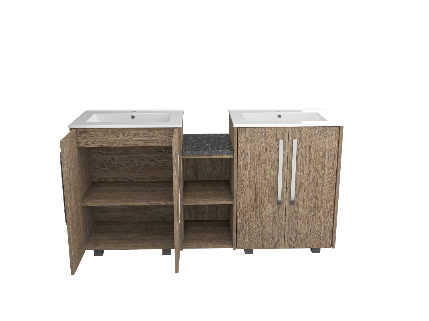 Enhance your bathroom with a freestanding double sink featuring a durable wood facade and double doors for extra storage. Timeless elegance meets functionality.