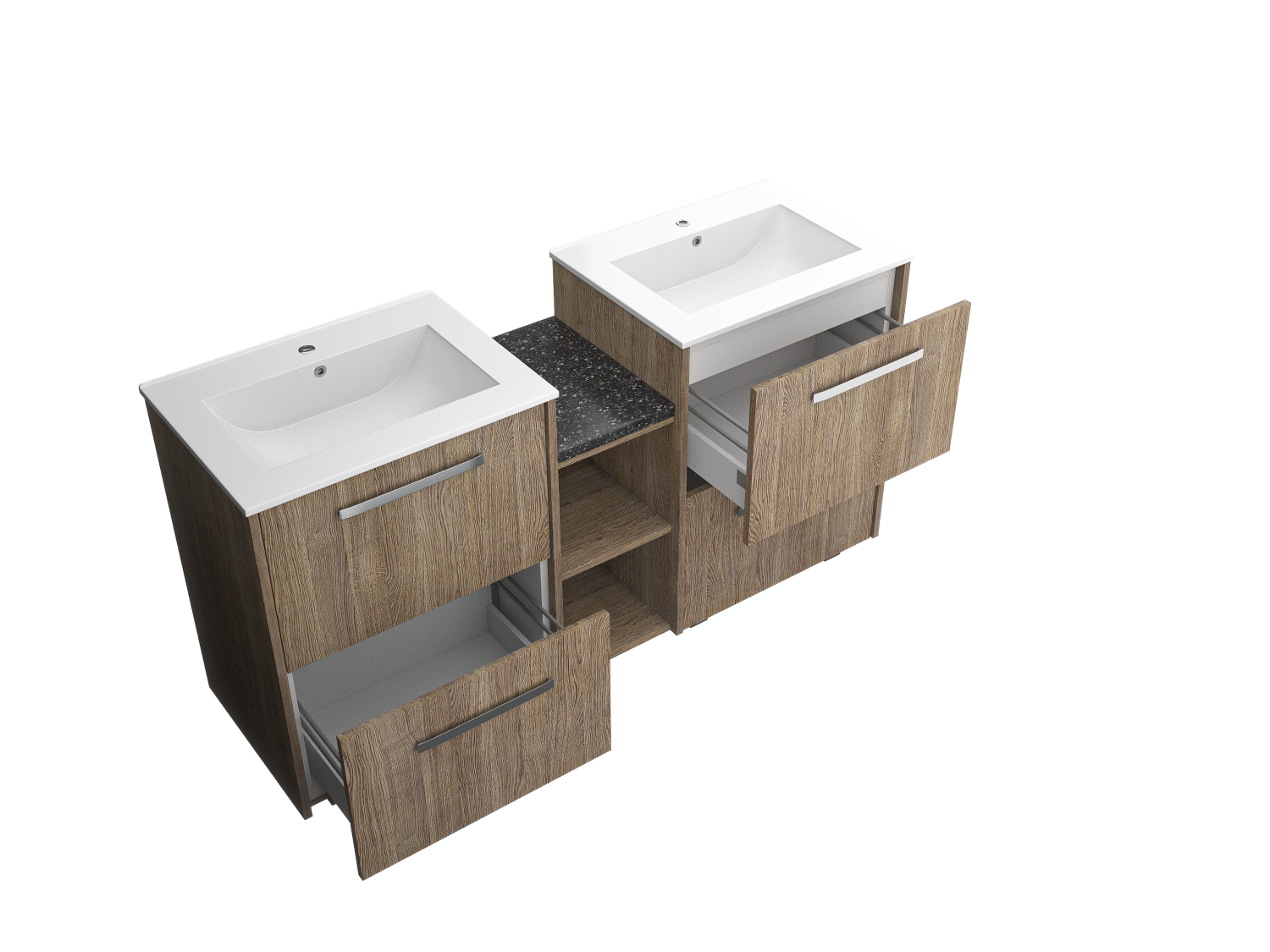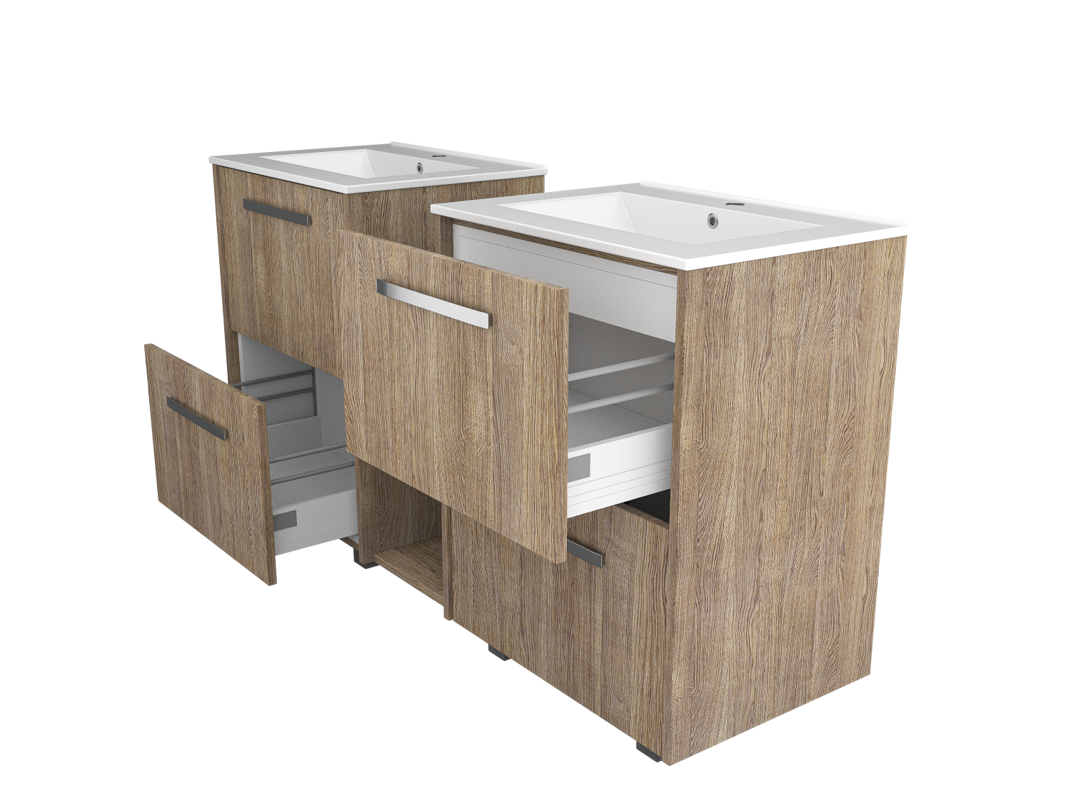 A spacious freestanding double sink with pull-out drawers, offering premium wood aesthetics and smart storage solutions for a stylish bathroom.
