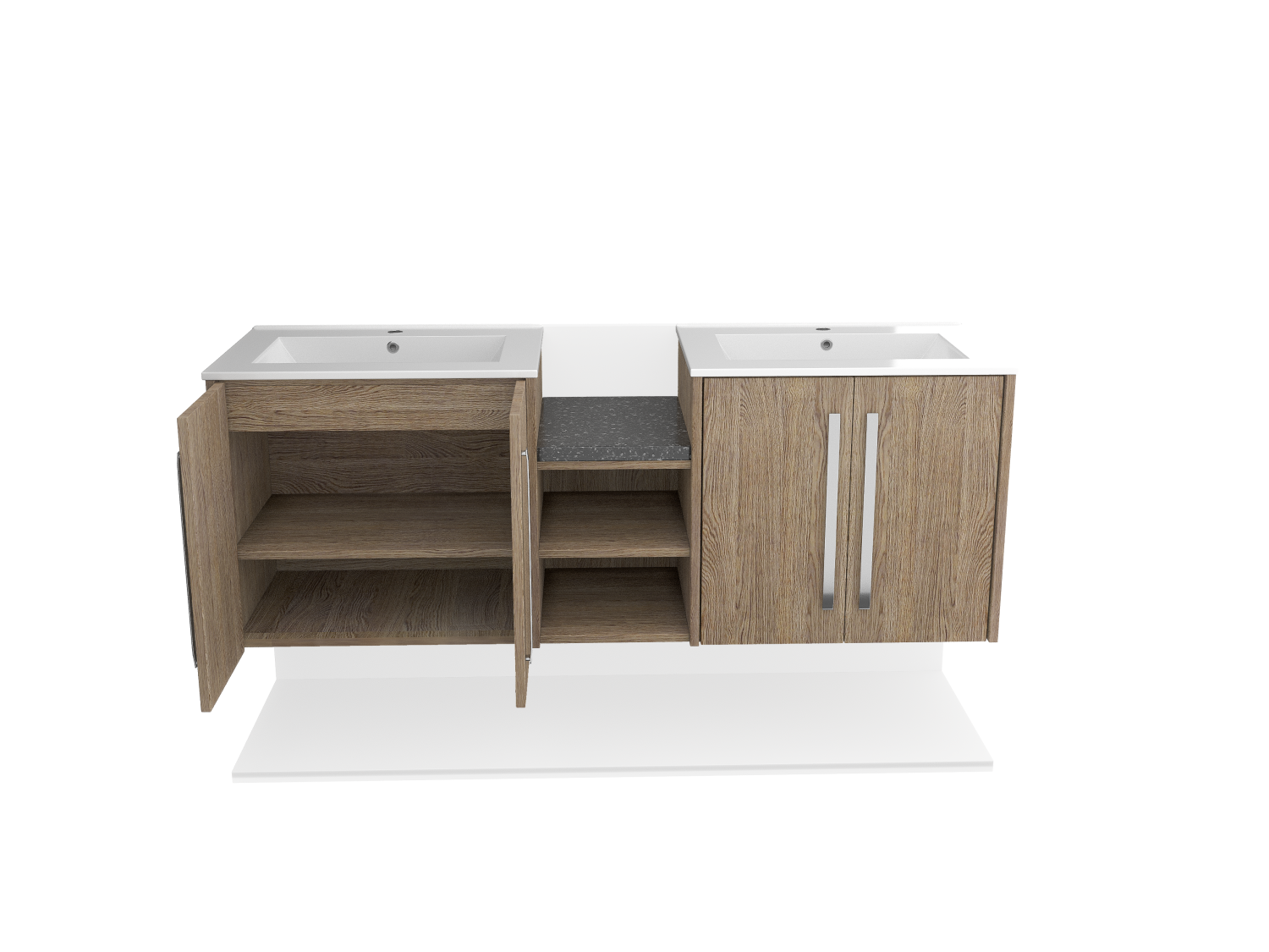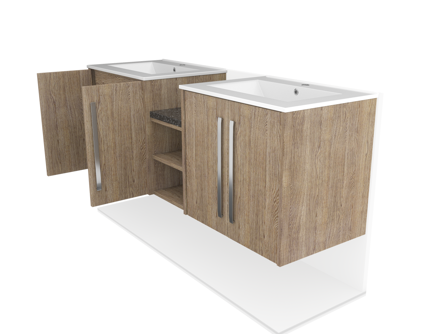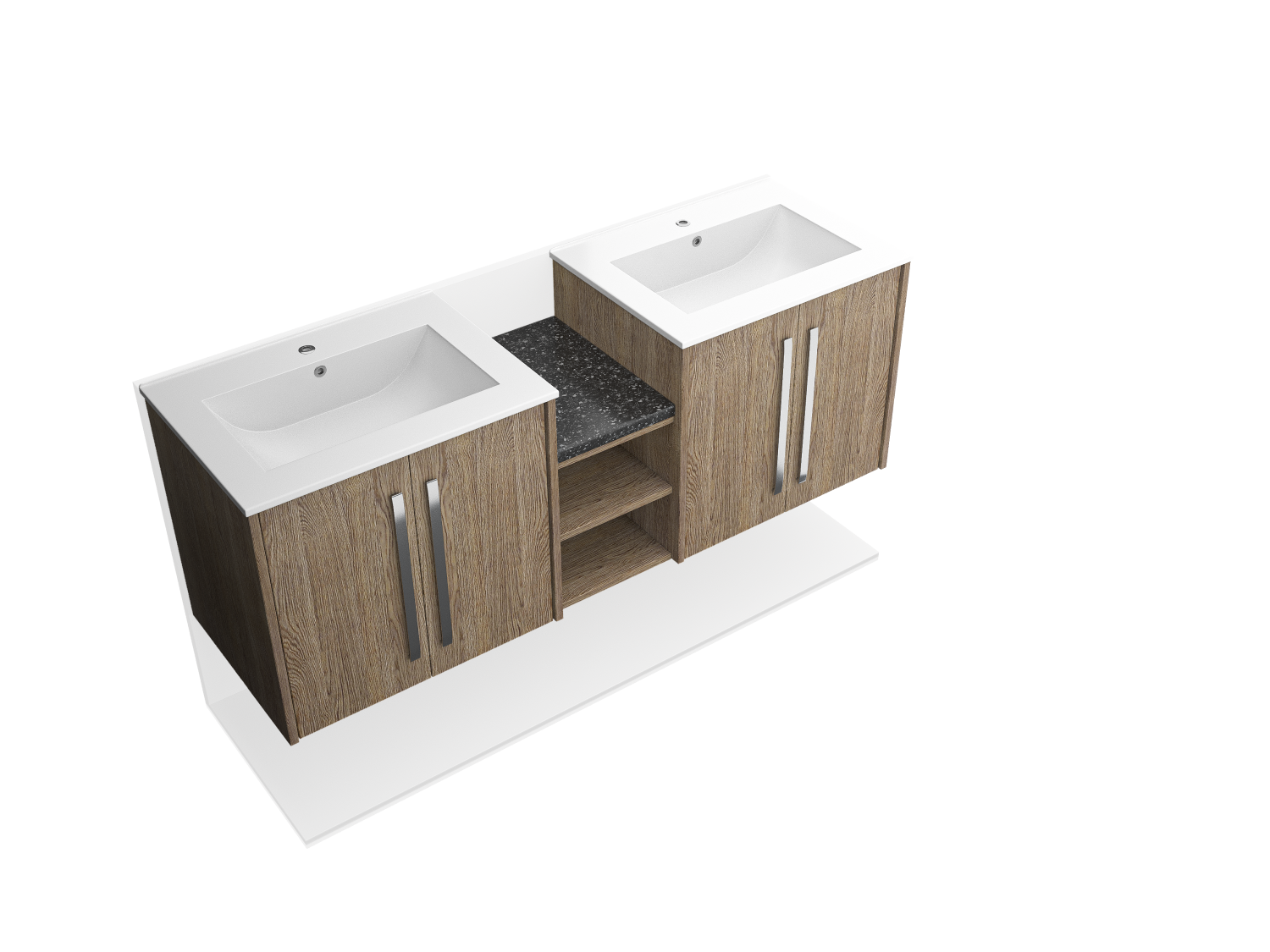 Upgrade your bathroom with a sleek wall-mounted double sink featuring a stylish wood facade and double doors. Space-saving, durable, and modern.