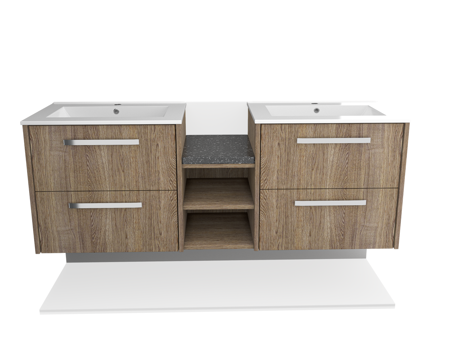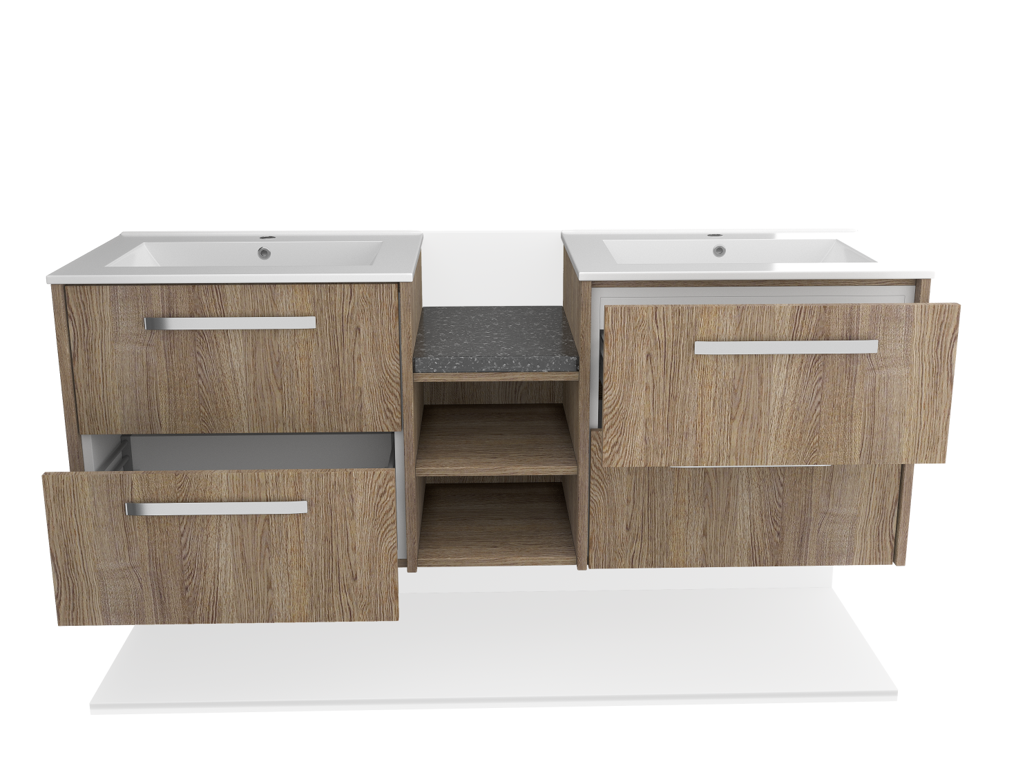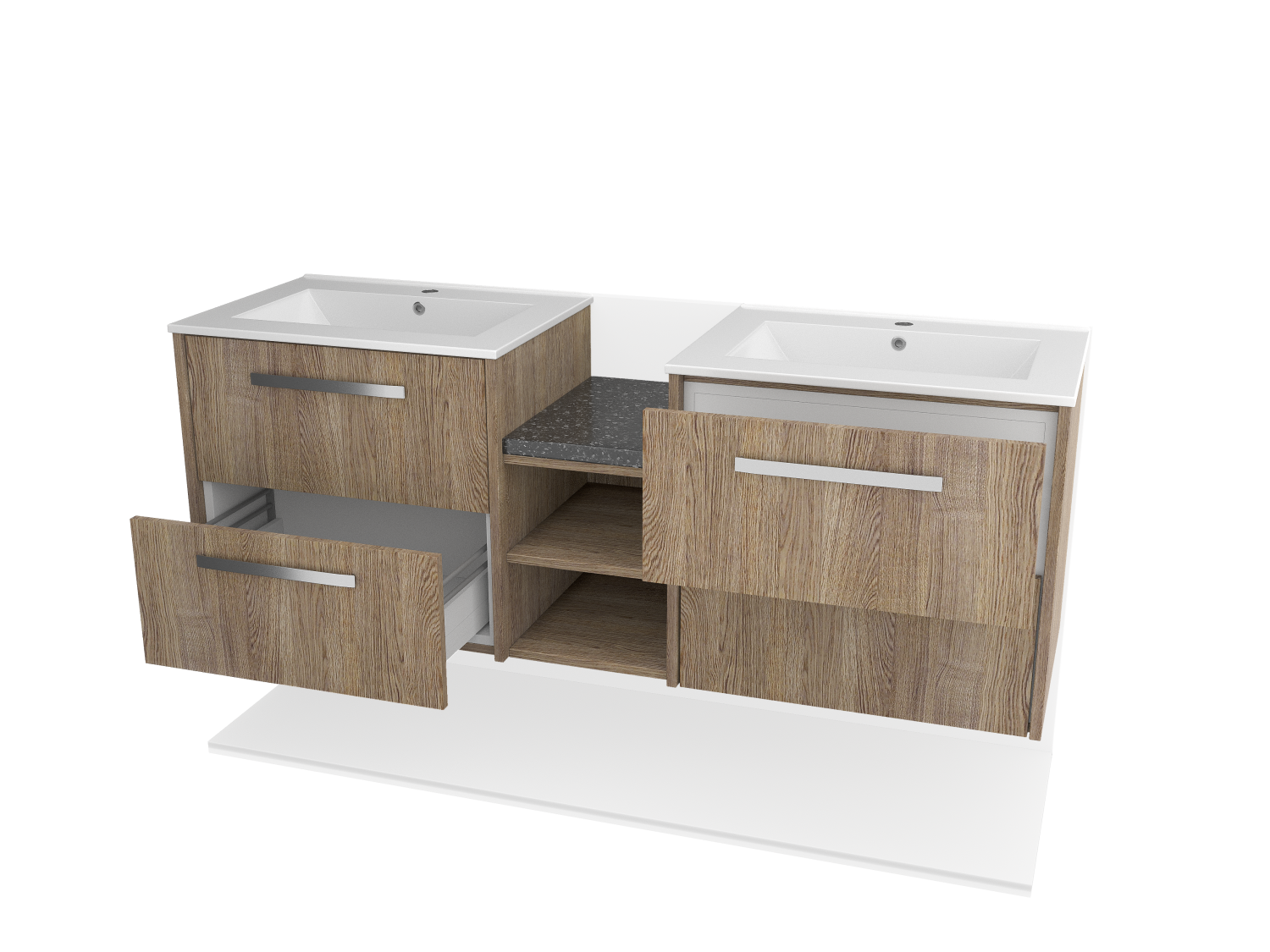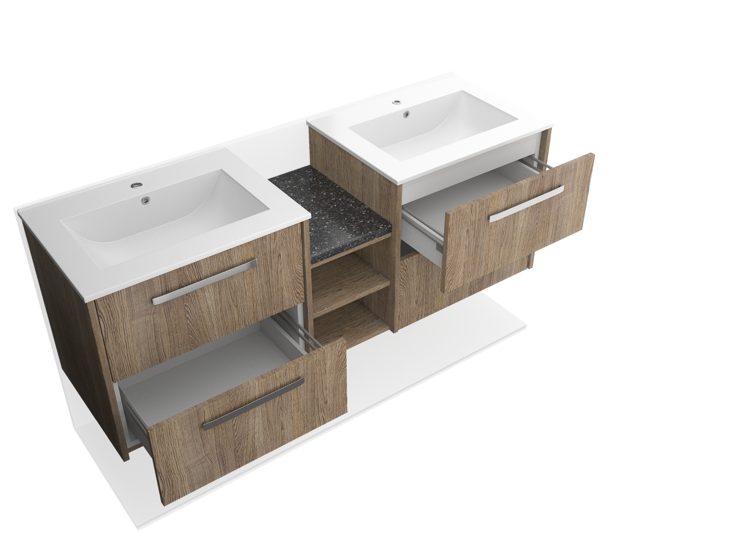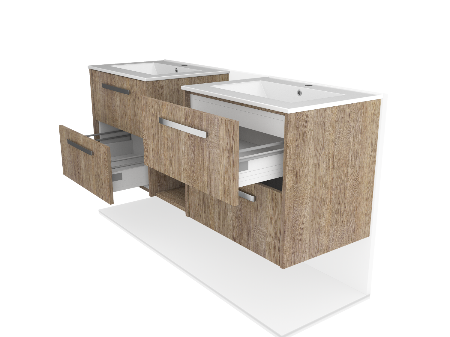 Maximize bathroom storage with a contemporary wall-mounted double sink featuring pull-out drawers and a high-quality wood facade. Perfect for modern interiors.